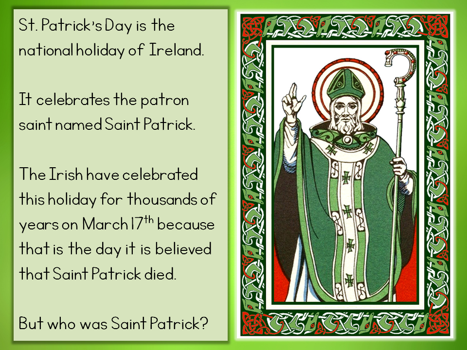 The presentation has information about Ireland and explains the origin of St. Patrick’s Day and how it came from Ireland to America using very simple terms that young students can understand and full-color photographs and pictures that grab their attention.