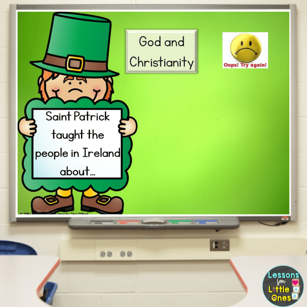 I turn on our Smart Board and act “surprised” when Lucky Leprechaun is there saying he snuck in to show a presentation about his favorite holiday. He then tells the students that at the end of the presentation they will have a chance to win some of his gold if they can answer his questions. This motivates the students to pay attention! They get very excited!