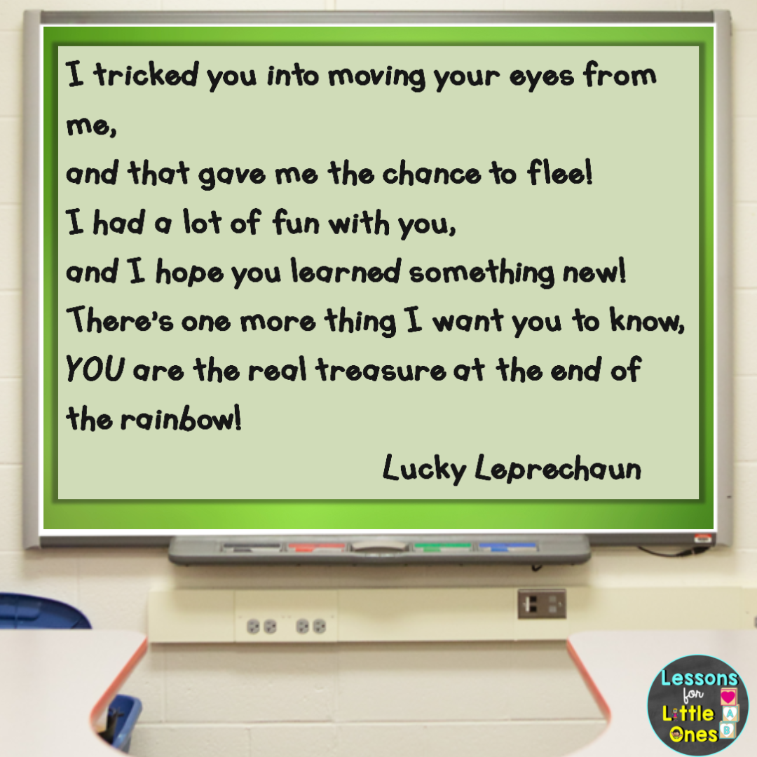 I then show the last slide which is a note from Lucky Leprechaun explaining that he was able to escape with the rest of his gold because he tricked the students into looking away from him and, as the students learned in the presentation, if you take your eyes off a leprechaun he will get away with his gold.