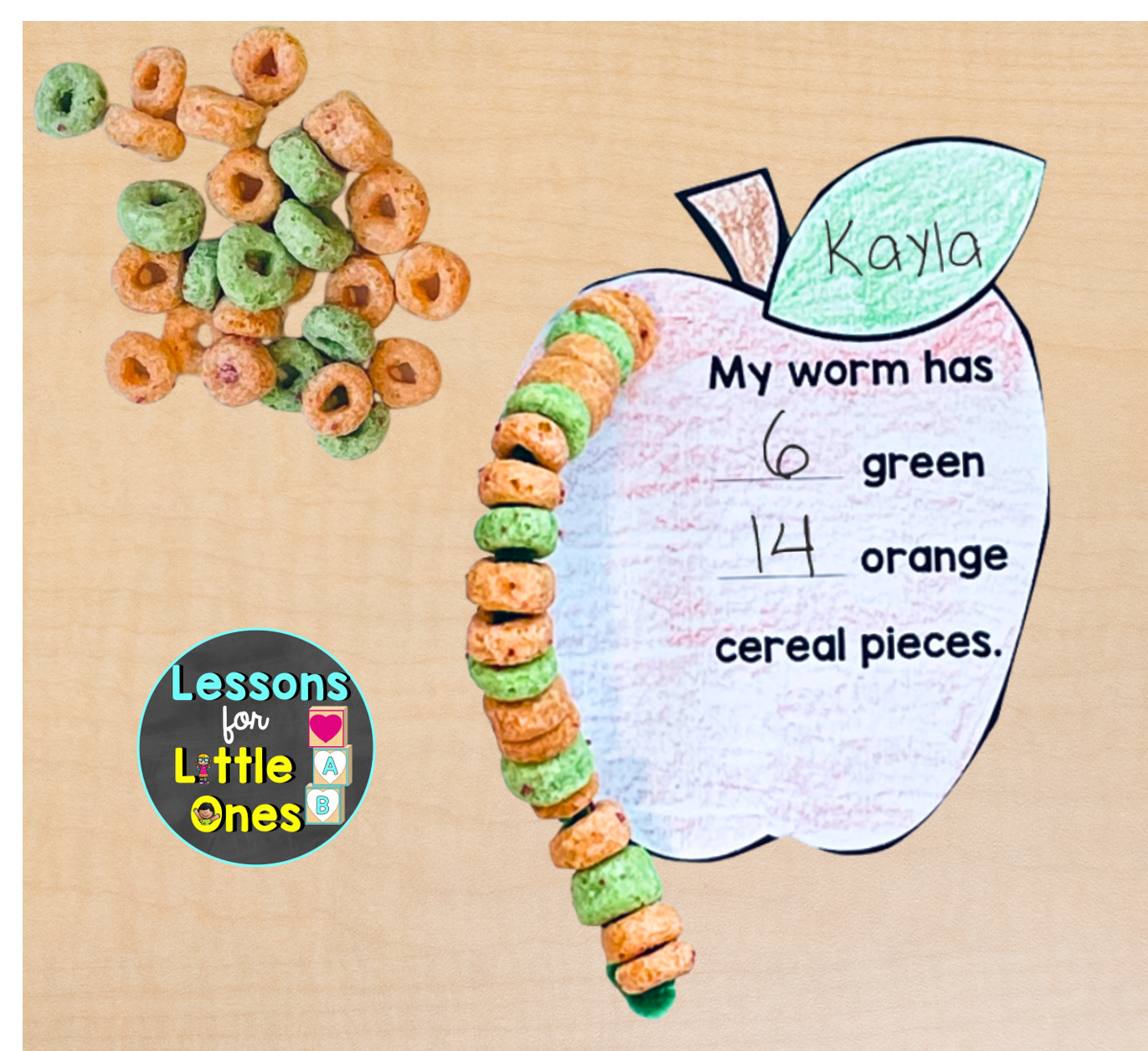 To differentiate, I create some apples where students add up their numbers and record the total number of cereal pieces used to create their worms.
