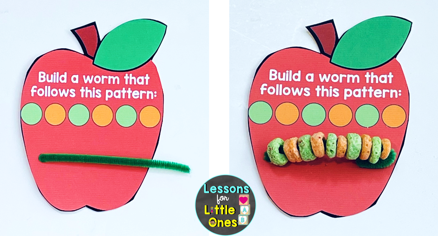 I give students apple pattern cards with a pipe cleaner threaded through the bottom along with some cereal, and they thread the cereal on the pipe cleaner following the pattern shown to create a worm.