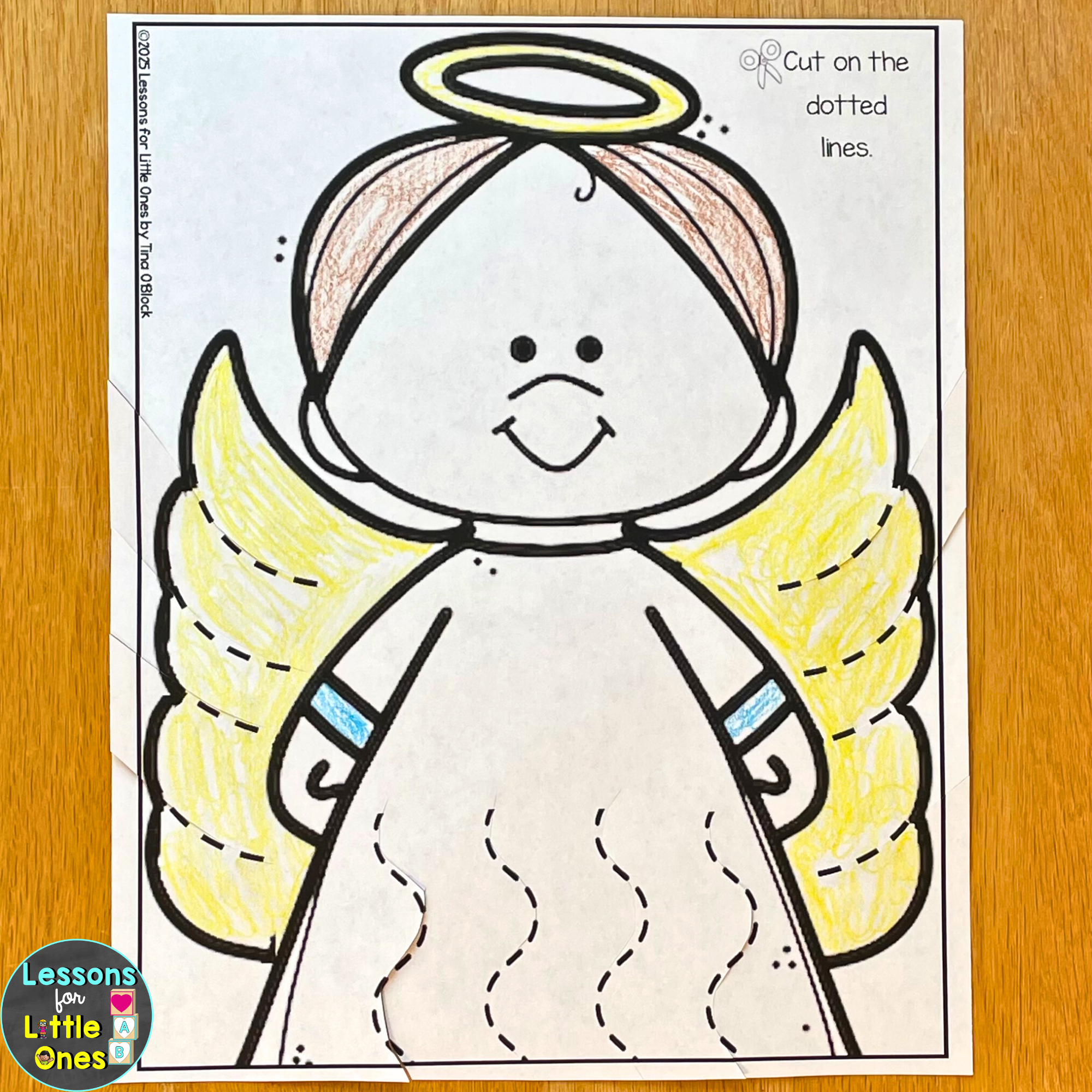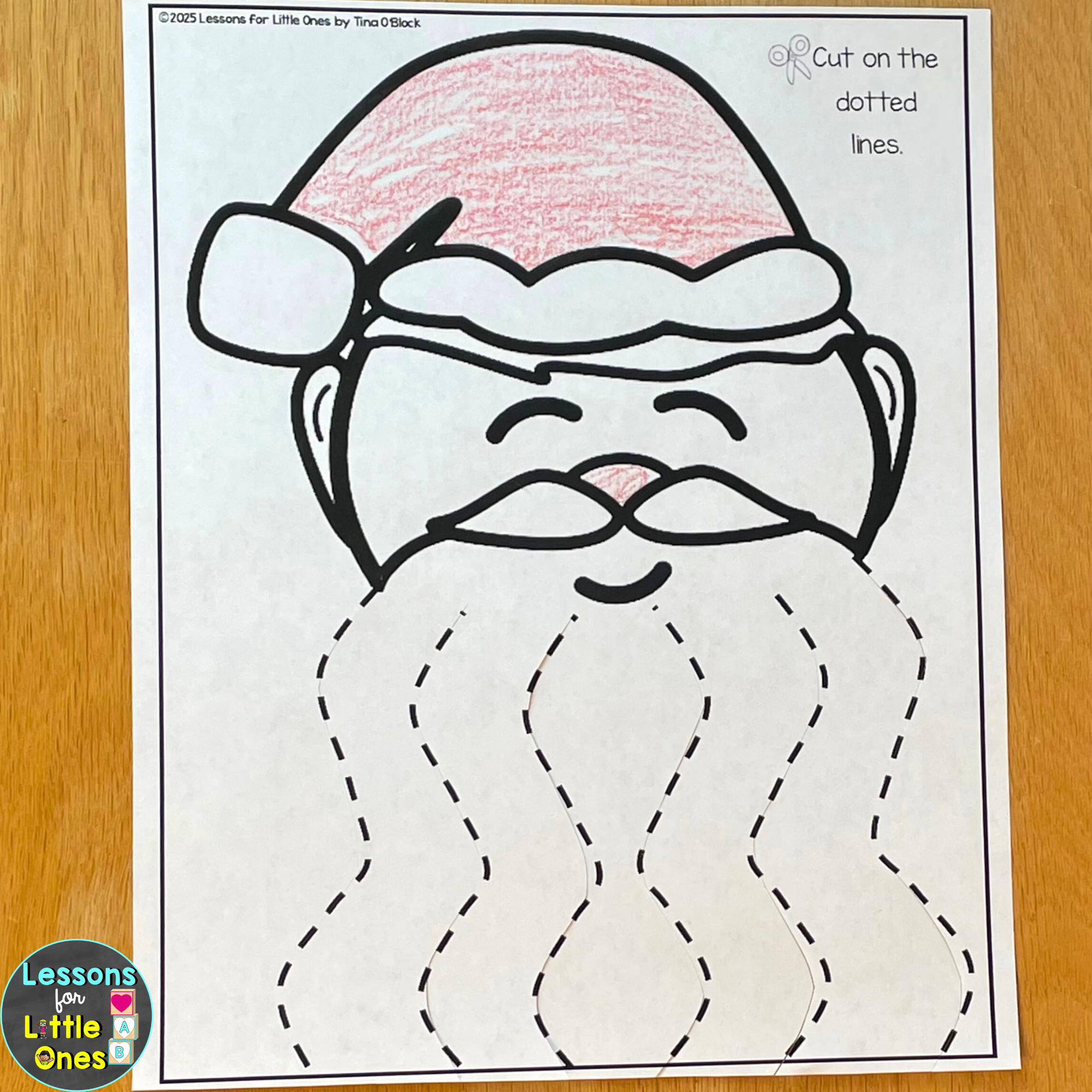 We start the season with straight and slightly curved lines, often paired with coloring. For example, students might cut along the dotted lines of Santa’s beard, angel wings, or trim elf hair to reveal a finished picture.