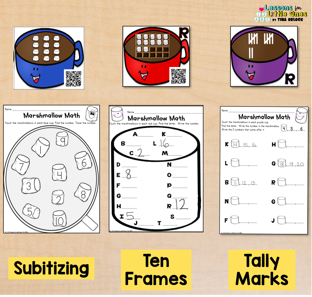 - Multiple number representations: ten frames, tally marks, and subitizing