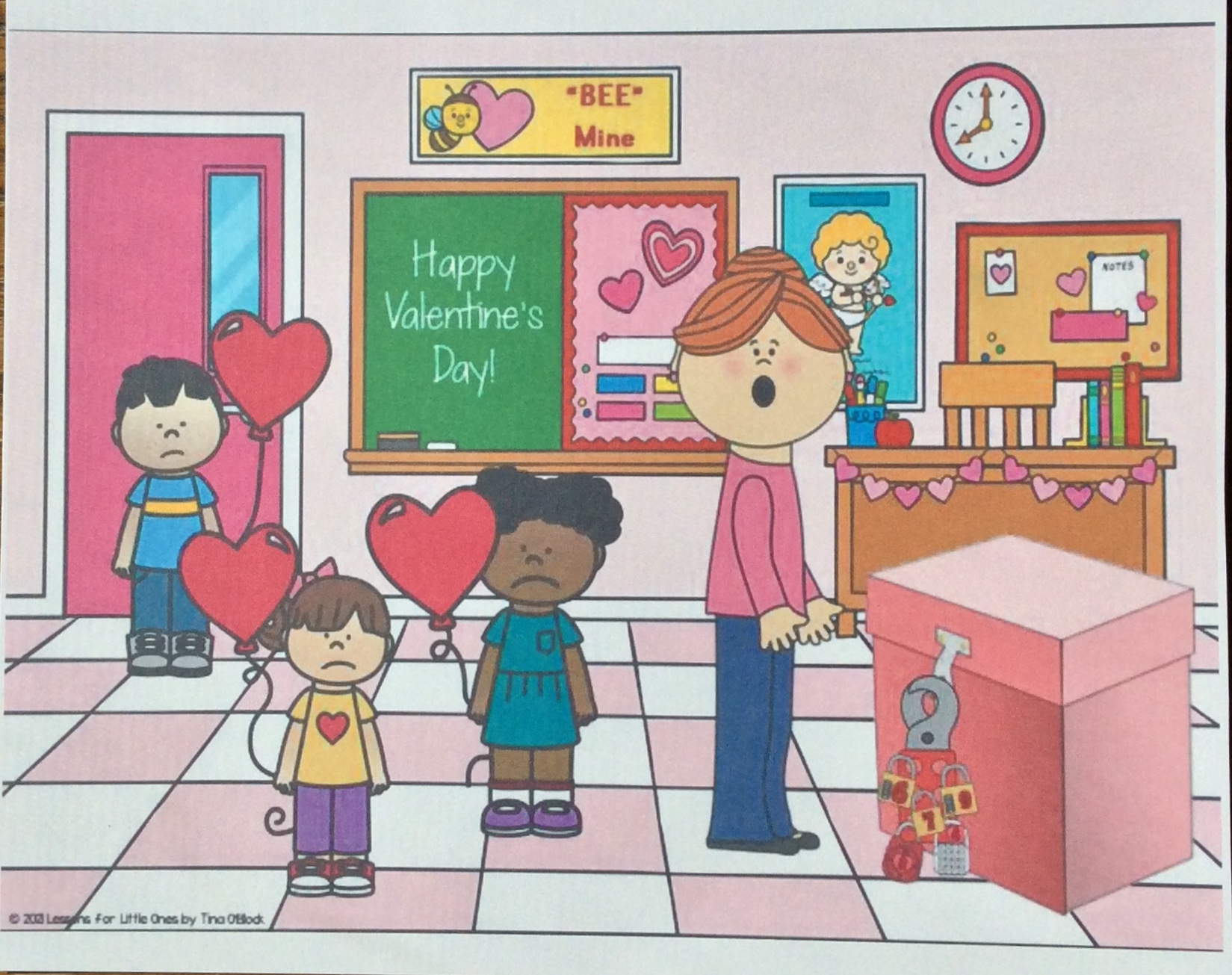 The teacher calls Cupid for help. Cupid sent his detective friend to figure out what happened. Cupid’s detective has found some clues but needs students’ help to solve them in time to save the Valentine’s Day party.