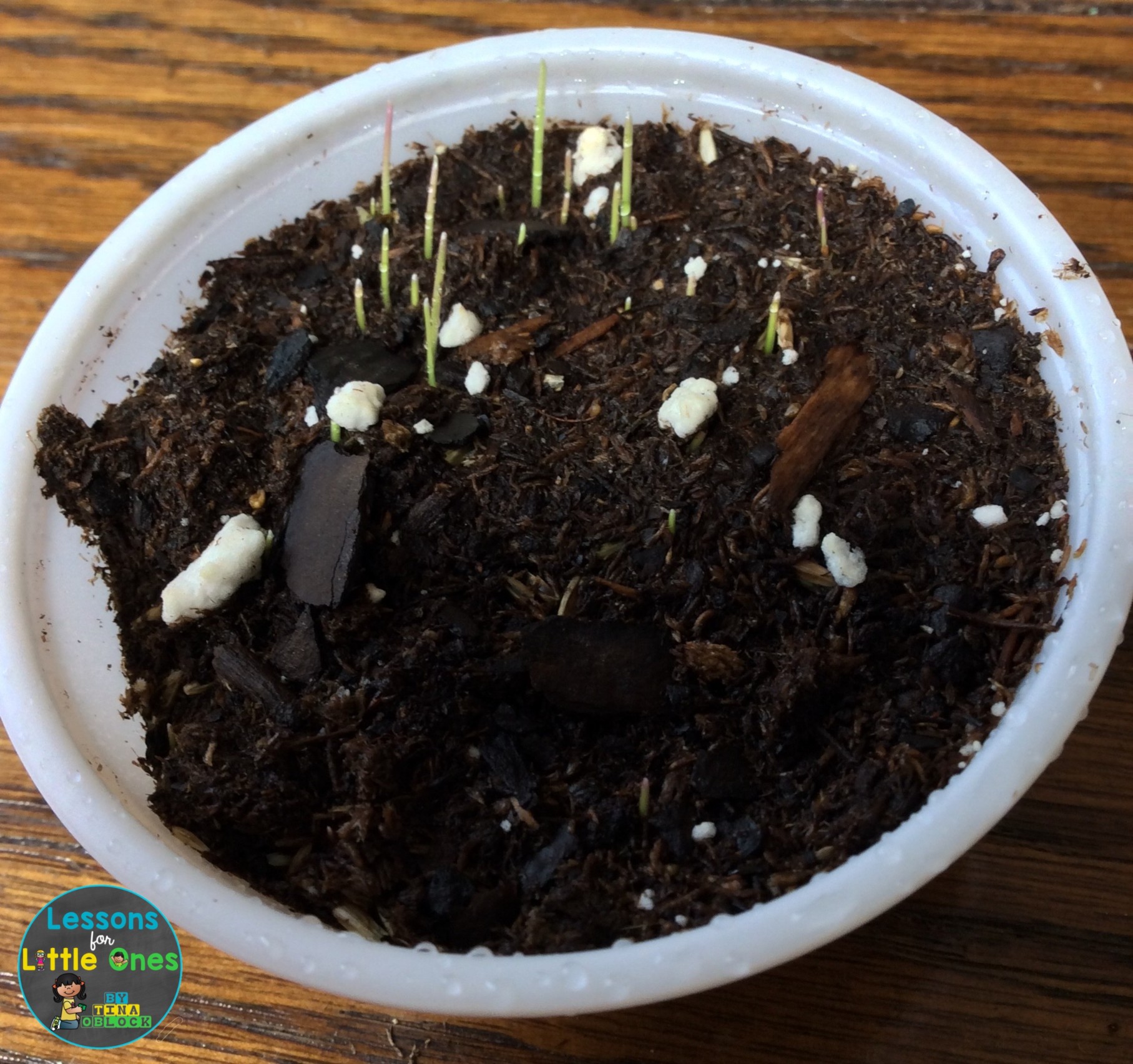 I have students use plastic spoons to fill their cups about ¾ full with dirt/soil. Then have them sprinkle grass seed on top of the dirt. There is no need to measure out the seed, however I usually tell students to cover the dirt with seed (the more seed, the more grass that will grow).  Then have them cover the seeds with a small amount of dirt.