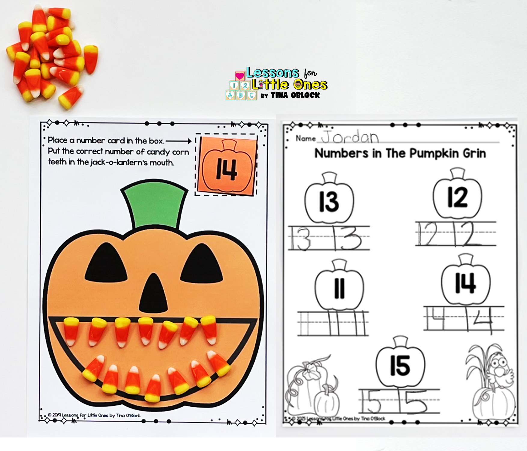 Cut-and-Paste Pumpkin Craft – Students cut out the pumpkin, stem, eyes, and nose and glue the pieces together before adding the candy teeth. This builds extra fine motor practice while still reinforcing math concepts. It also makes an adorable display for a fall bulletin board!