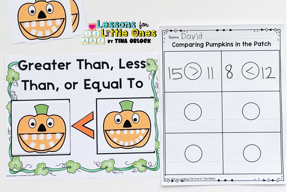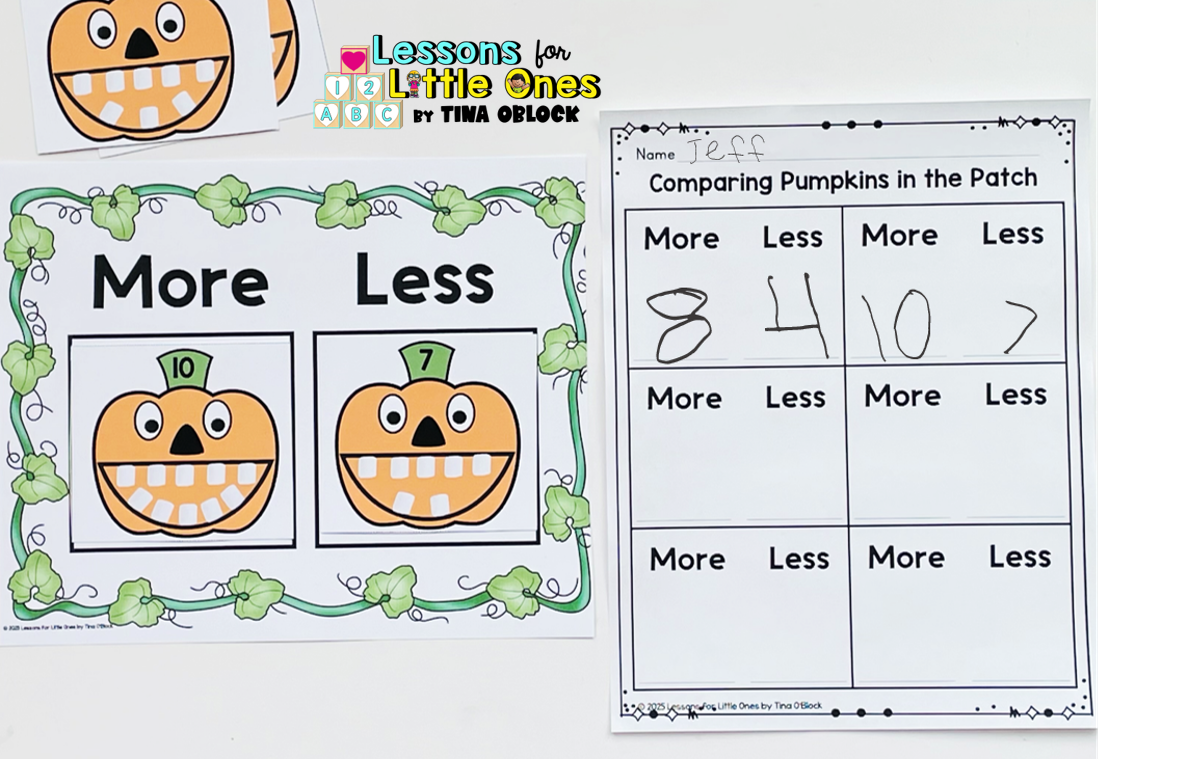 In this activity, students choose two pumpkin cards, count the teeth, and decide which one has more or less, OR if the amounts are greater than, less than, or equal.