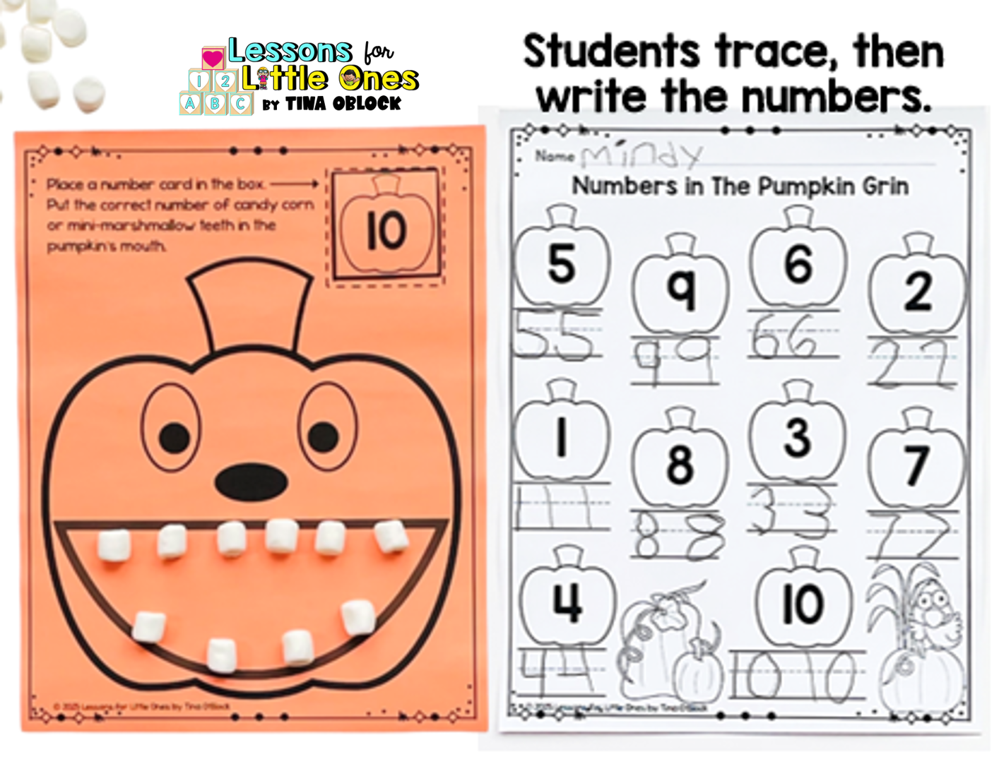 There’s something about crafts that makes math stick for young learners, and this pumpkin activity is always a favorite. Students use mini marshmallows or candy corn to give their pumpkins silly smiles (grins).