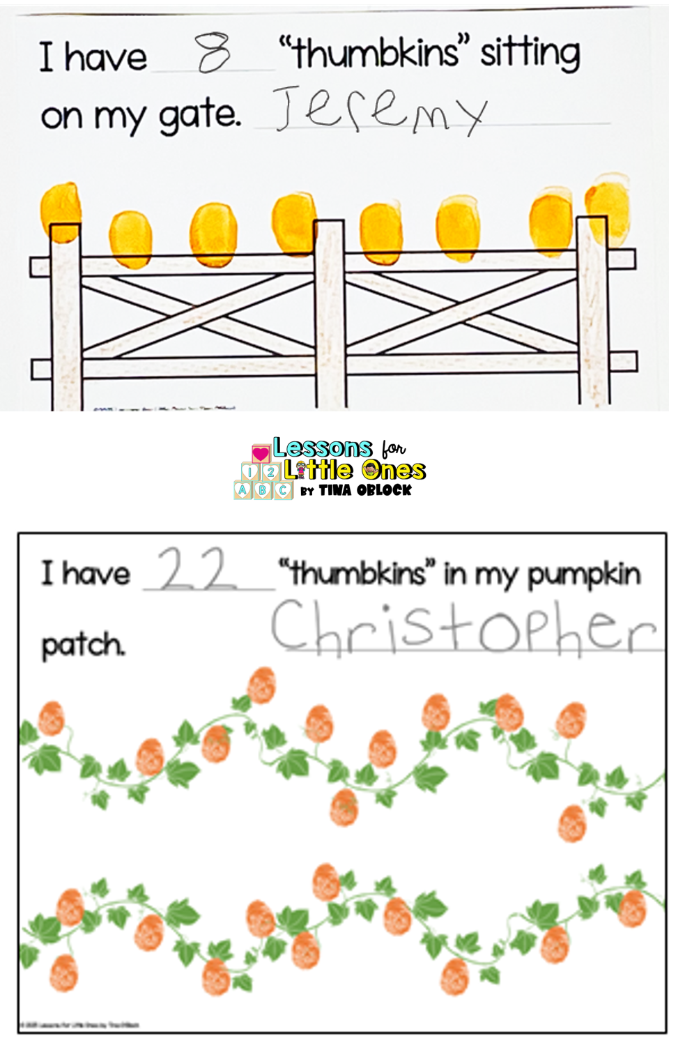 I like to use the Pumpkin Grin Math Crafts for whole-group fun (it’s always a hit!), the cute Thumbkin Pumpkin Crafts during small groups, and then rotate the Counting Mats and Comparing Numbers activities into my math centers.
