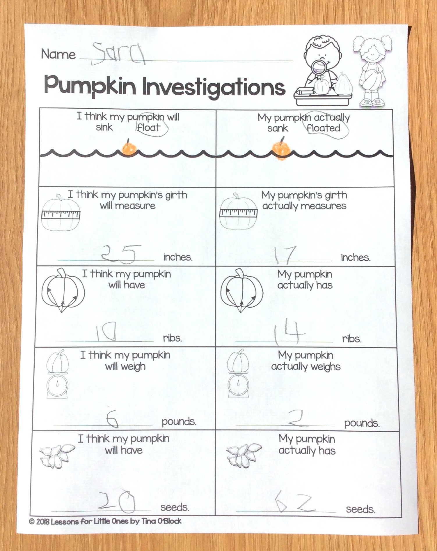 I like to give them “official” Pumpkin Investigation pages on which to record their predictions and results. It makes them feel like little scientists! They have pictures to help guide them along. They record their predictions on the left hand side and the actual results of the investigation on the right hand side.