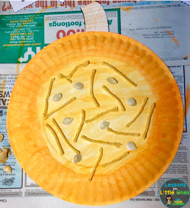 First, students paint the back of a paper plate orange. They paint the inner section of the plate a lighter orange or yellow/orange color to resemble the inside of the pumpkin. The outer part of the plate with the ridges represents the outside of the pumpkin (the skin and ribs).