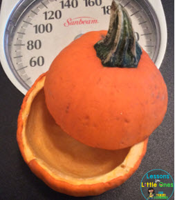Weigh the pumpkin and then cut it open, clean out the seeds and strands, and weigh it again to see the difference.
