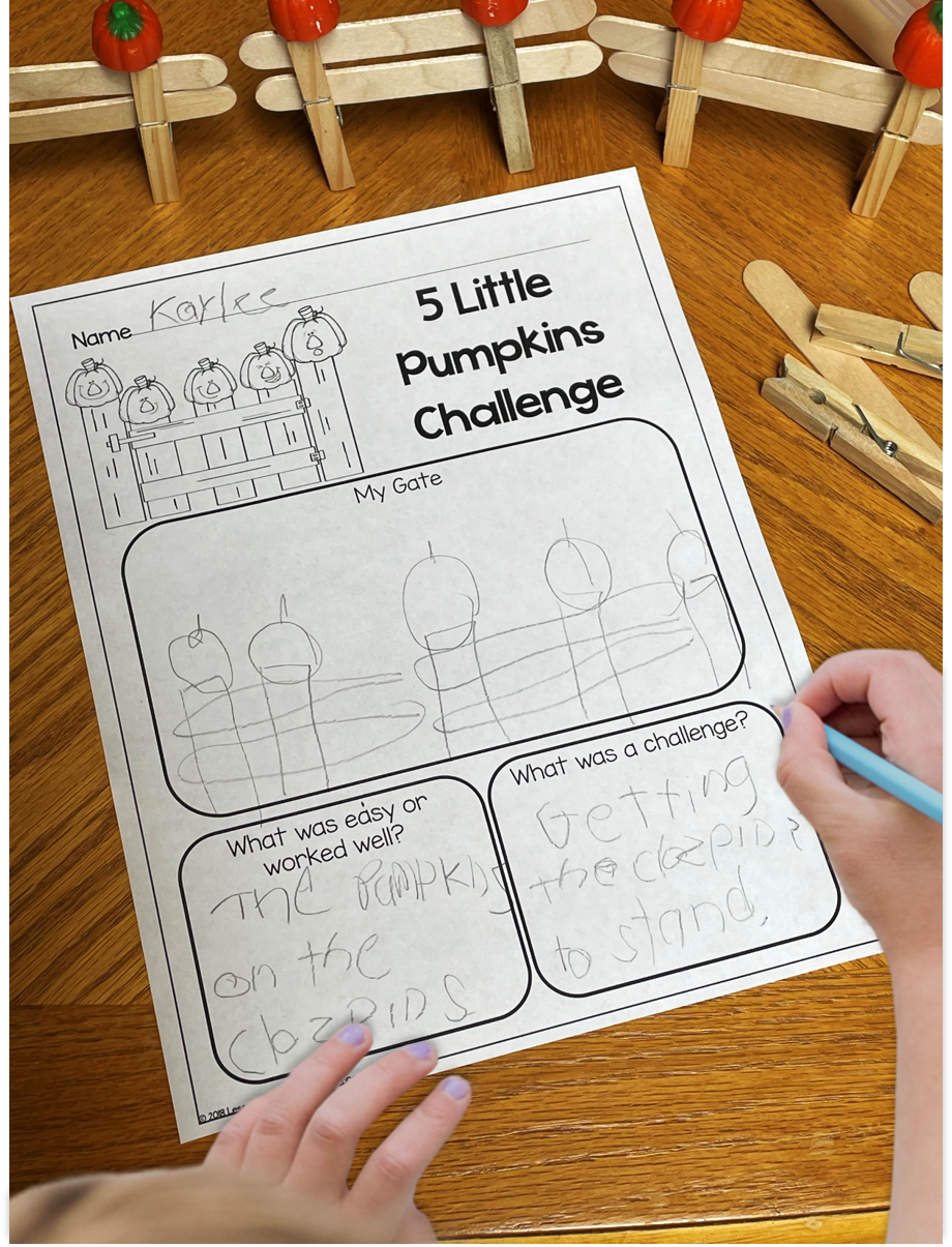 For very young students who can’t write all their thoughts, I have them upload a picture of their pumpkin gates to their Seesaw journals and use the Record tool to tell me what was easy and what was a challenge.