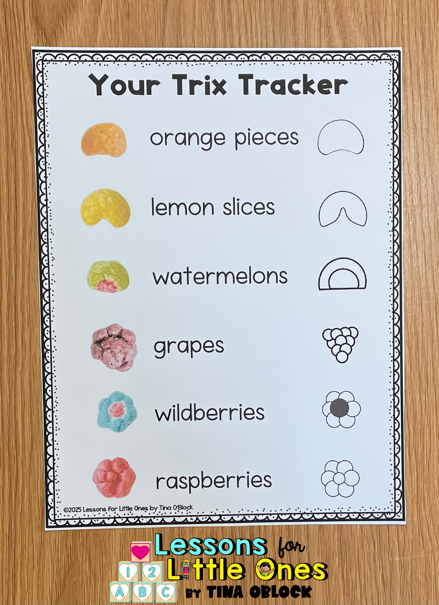 Before starting the activity, I like to review the “Trix Tracker” key with students so they know which cereal matches which fruit picture on their pages before they begin.